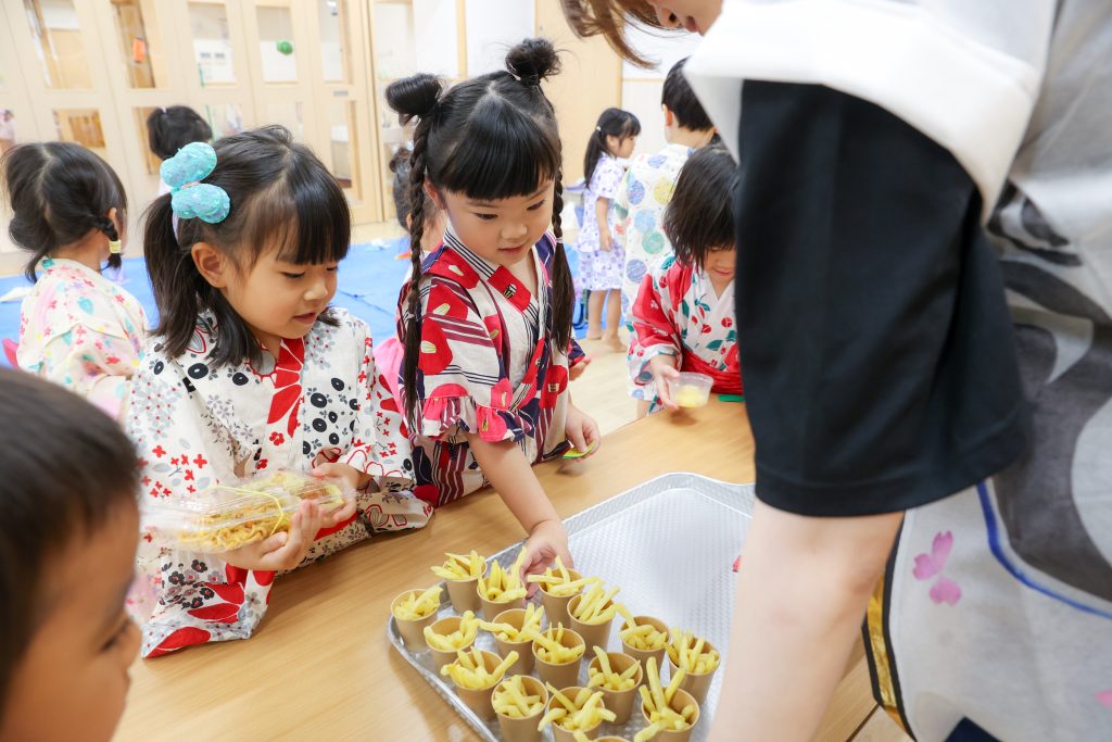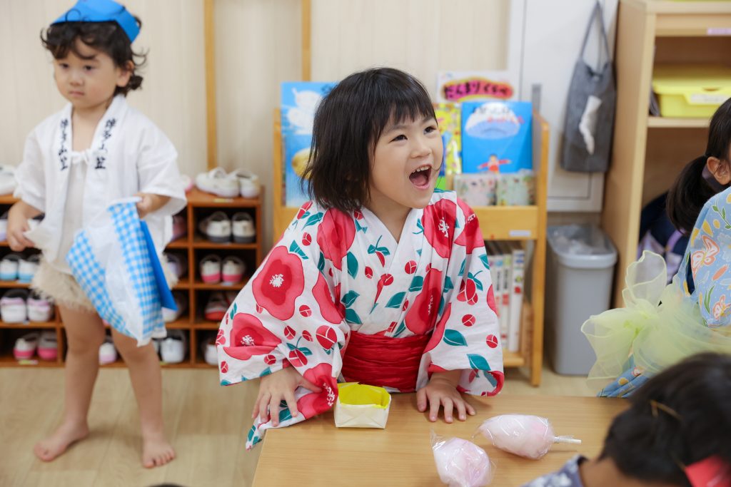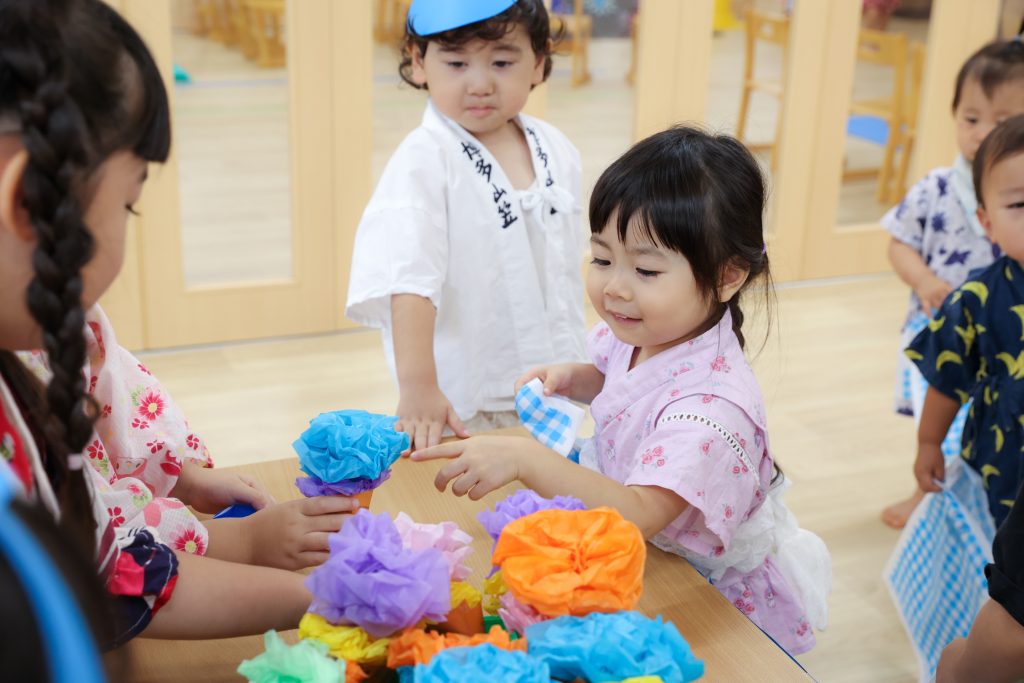 夏祭りではたいよう組さんがお店屋さんの店員さんになりました。ほし組さんの1.2歳児さんはお客さんになって屋台を回りましたよ♪