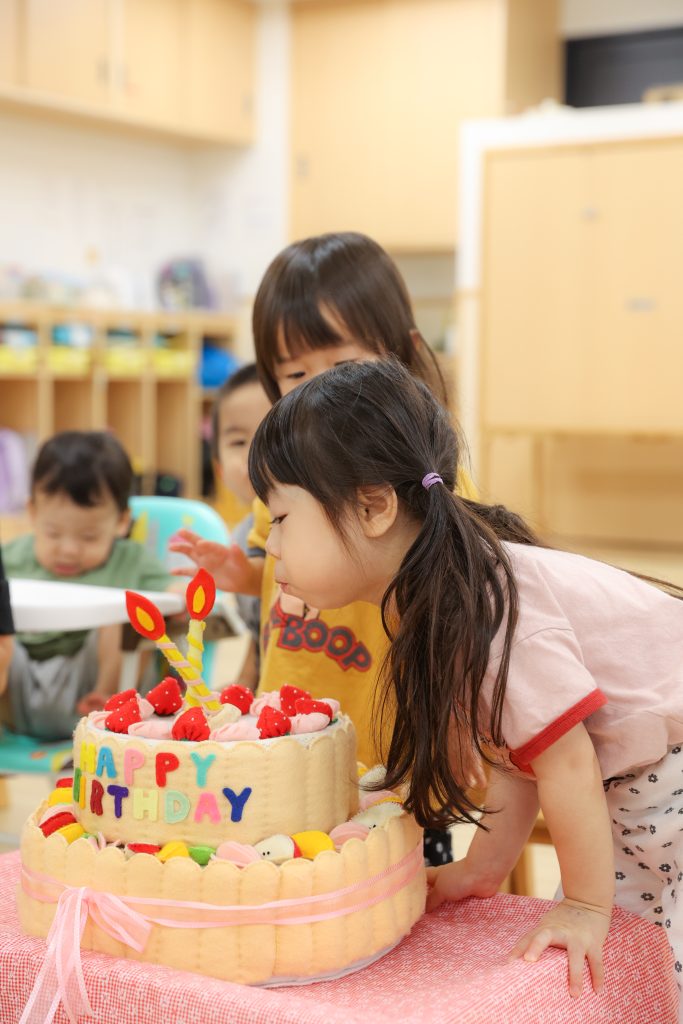 お誕生日を祝われる子たちは、みんなの前に一列に並んで椅子に座るので緊張している子や嬉しそうな表情をしている子と様々でした♬