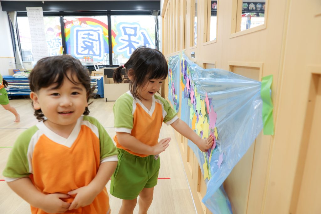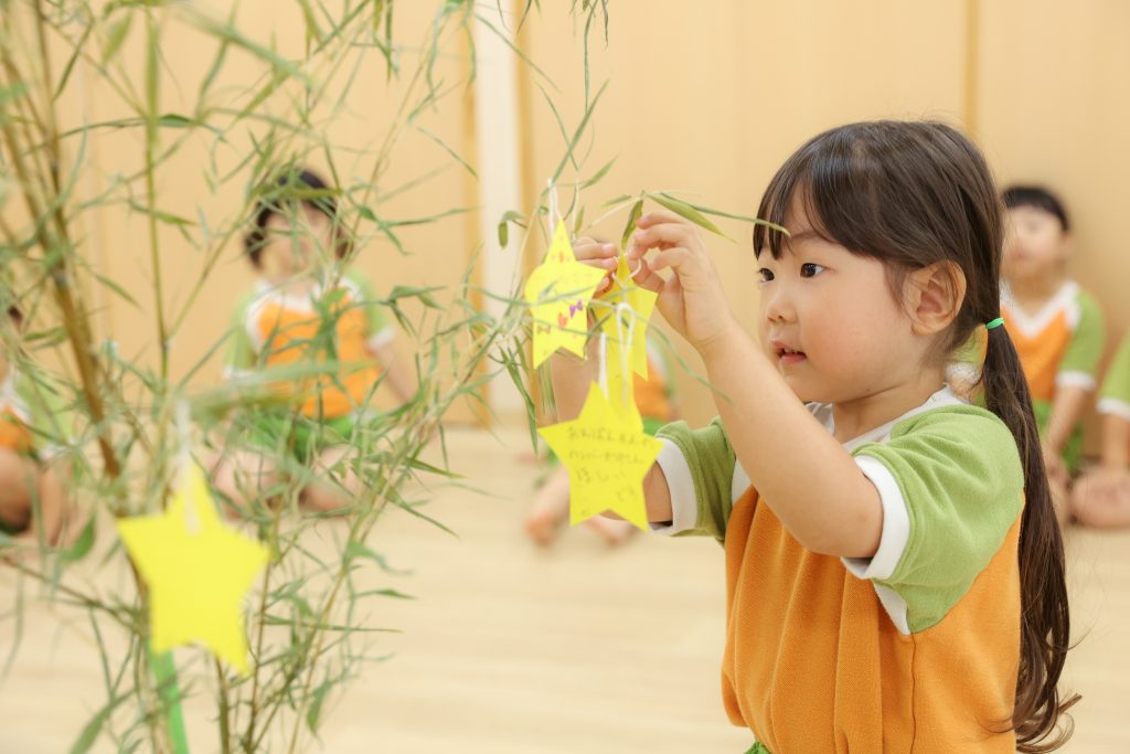 その後、ほし組さんとたいよう組さんのそれぞれのお部屋に戻り、本物の笹に短冊を飾って星探しゲームをしました。