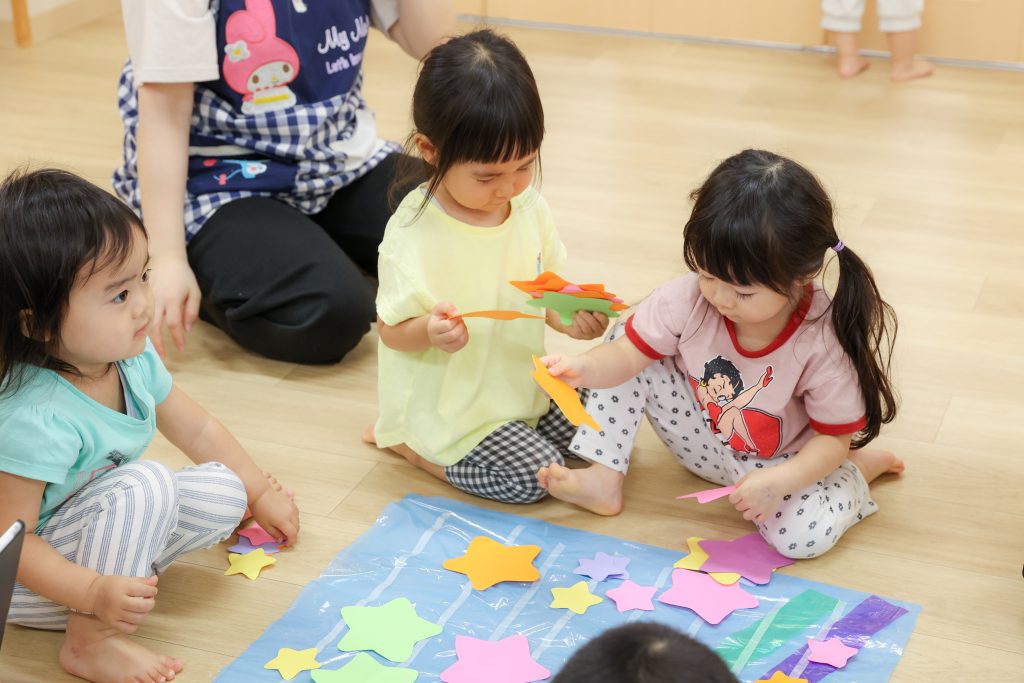 ほし組さんは、先生と一緒に短冊を笹に飾りました♬星探しゲームでは床に置いてあったたくさんの星を両手いっぱいに拾って天の川にペタペタ貼って楽しんでいましたよ🌌