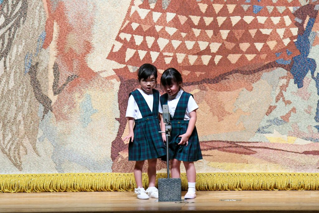 4月から始めたばかりのバレエ。2歳児さんから5歳児さんがかわいらしい衣装に身を包み、ステージに出ていきました。「お花のポーズ」をしたり、仲良く手を繋いでリズムに乗ったり、おけいこの成果をみせていました!