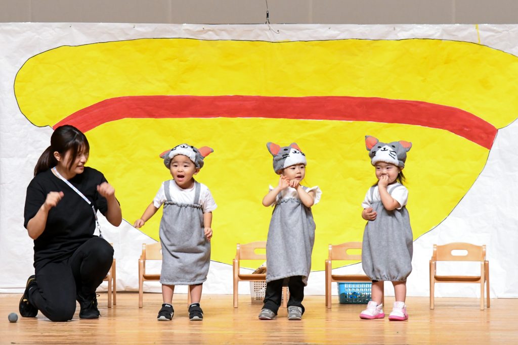 2歳児さんの劇「ぞうさんのおおきなぼうし」では、動物になりきって表現を楽しみました。「これはなにかな?」「大きなぼうし!」の掛け合いも大きな声で言いました👒最後には、「こぶたぬきつねこ」に合わせて、鈴とタンバリンのリズム合奏も上手にできました❤