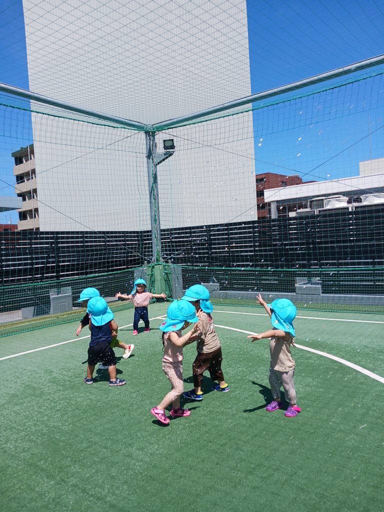 水遊びは、近隣の商業施設のカイタックスクエアガーデンさんの4階にあるサッカー場で水遊びをしました。子どもたちは水をかけて欲しい子は先生の近くで待機をしており、先生がホースで水をかけると喜んでいましたよ♬そして、全身びちょびちょになりながらも元気いっぱいに走り回って楽しんでいました!